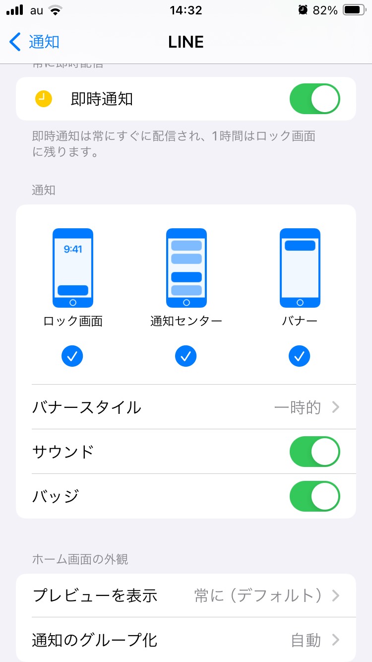 「設定」=>「通知」=>「LINE」の画面から上記設定で通知を受け取れることを確認しています